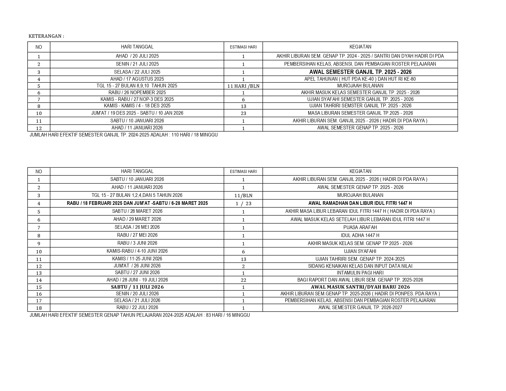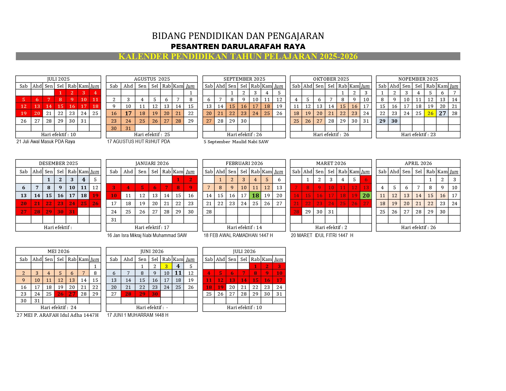 Kalender Akademik Minggu, 09 Januari 2022 Pesantren Darularafah Raya 0 komentar Kalender Akademik Tahun Ajaran 2025-2026 untuk Kelas 1,2,3, 3 Takhasus, 4 dan 5. DOWNLOAD Bagikan artikel ini: